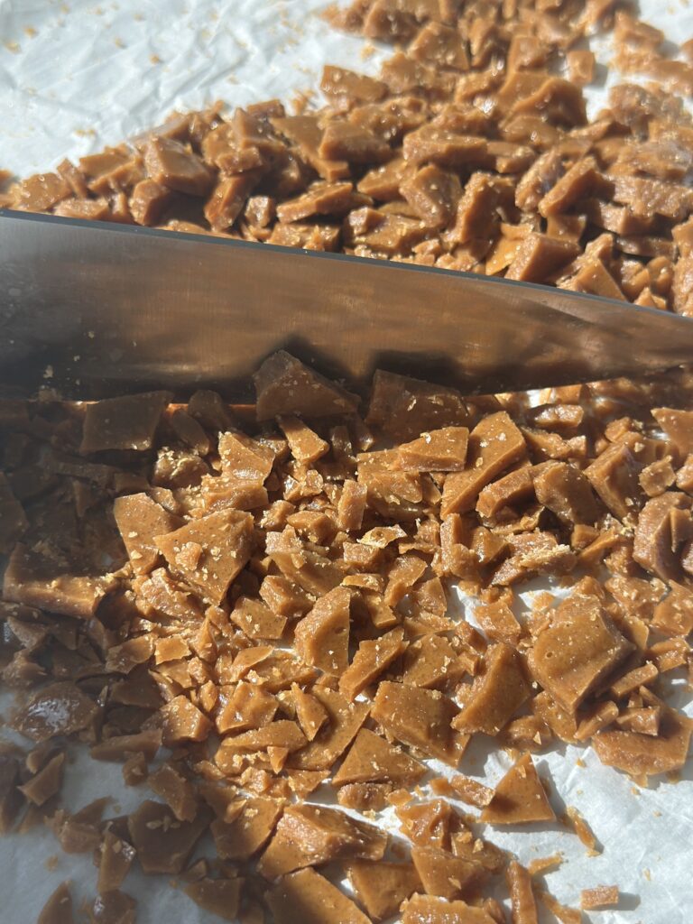 Allow the toffee to cool for 20 minutes, then chop up with a knife to the size pieces you’d like.