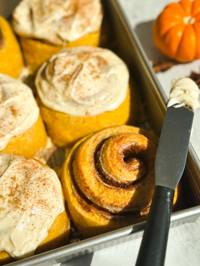 The filling and dough are packed with cinnamon and spice, for that perfect balance to the pumpkin. Make a quick and easy maple brown butter cream cheese frosting that pairs beautifully with the rolls and you’re taste buds will be in heaven. Thank me later!