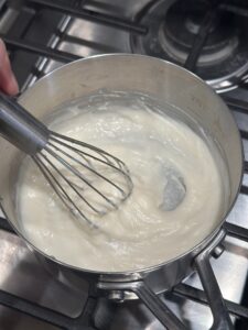 Before you get started on mixing your dough, you’ll make your tangzhong. Whisk milk and flour together in a small saucepan.