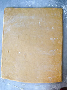 - On a lightly floured surface, roll dough into a 12×15-inch rectangle with the 12-inch edges being the bottom and top. Use a tape measure or ruler if needed to measure. Trim any excess edges if needed to get a clean line.