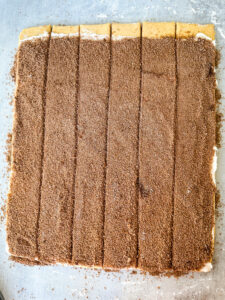 On a lightly floured surface, roll dough into a 12×15-inch rectangle with the 12-inch edges being the bottom and top. Use a tape measure or ruler if needed to measure. Trim any excess edges if needed to get a clean line.