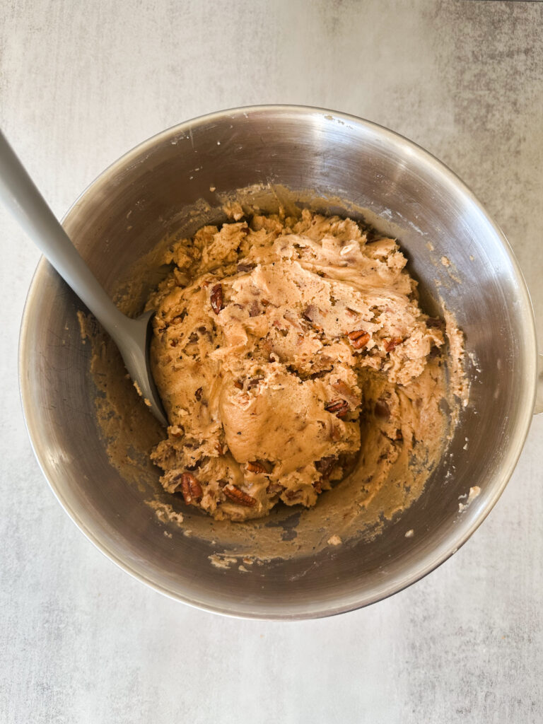 Fold in the toffee bits, toasted chopped pecans, and chocolate pieces, ensuring they are evenly distributed throughout the dough. You can add them to the mixer if using, and pulse them through the dough for ease. Make sure the bottom ingredients of the bowl are folded in and all of the ingredients are incorporated.