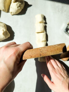 Starting at the long edge of the dough, roll up the rectangle into a log. Make sure you pinch the seams shut all around the log. Use a knife or a bench knife to cut the log into 5 sections, cutting in between the pieces of cheese. You can use your fingers to feel where the spaces are between the cheese.