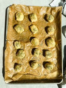 Transfer the bites to the preheated oven, and bake roughly 20 minutes until the tops are a deep golden brown color. Internal temperature of the bites should be between 200-205 F when they’re done.