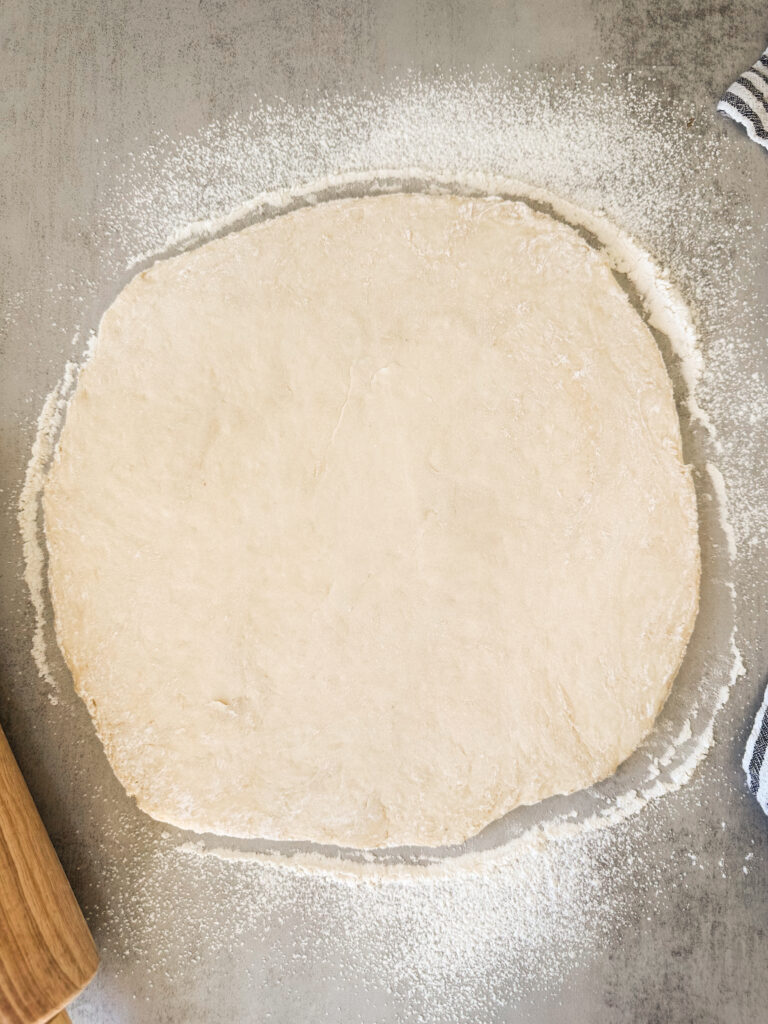 Roll out the dough into a rough rectangle, about 1/2 inch thickness. This doesn’t need to be perfect!