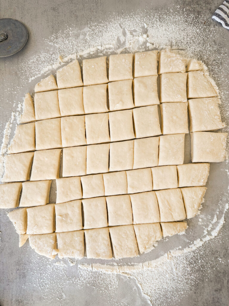 - Using a sharp knife or pizza wheel, cut the dough into eight 1 inch strips vertically. Repeat this step the other way, cutting the dough into 1 inch squares cutting horizontally as pictured below. You should have roughly 50 squares.