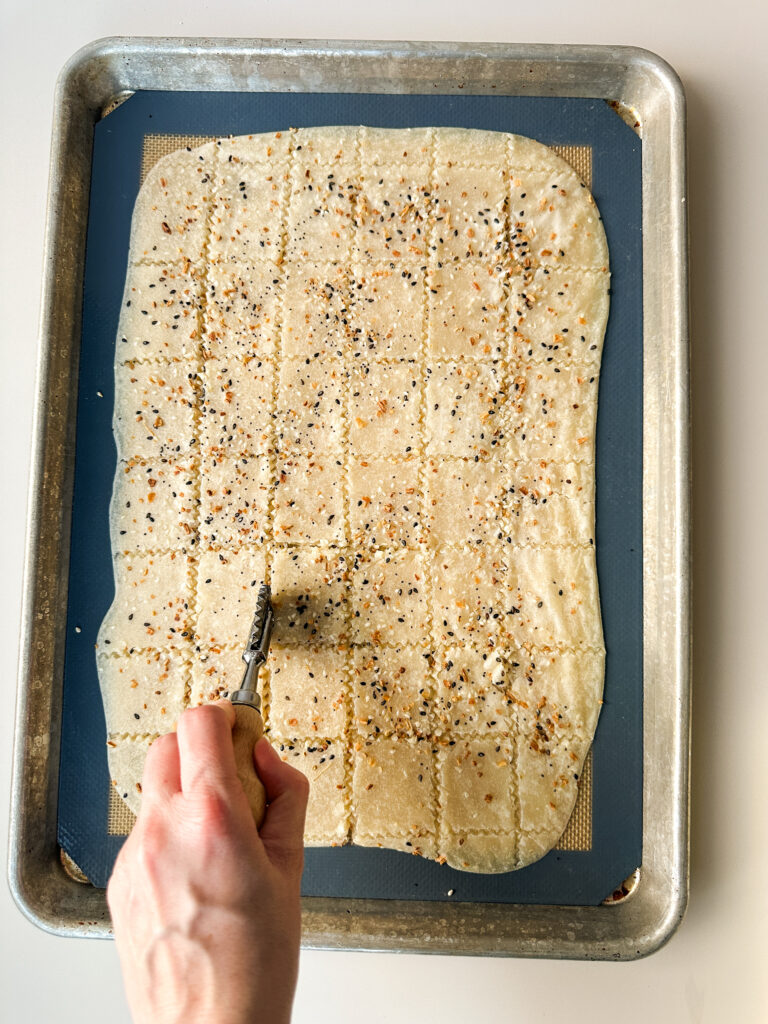 - Bake at 375°F for 12–15 minutes, just until the surface looks set and slightly dry but not browned. Remove the pan from the oven and score into cracker-sized pieces using a pizza cutter or pasta wheel.