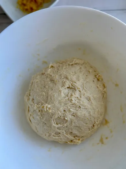 In another bowl add the flour, baking powder, baking soda, and salt. Whisk together dry ingredients, and add to your wet ingredients. Mix with a dough hook or spatula until a shaggy dough forms.