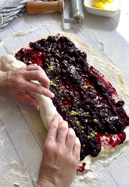 - Roll up tightly from the long side into a log. Slice into even 9–12 rolls using a bench scraper or sharp knife. These rolls are messy, and you may have extra blueberry compote oozing out when you roll and cut them. That's okay, it will make for moist rolls!