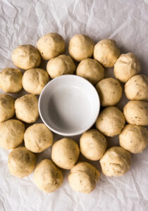 Turn out your dough onto a clean work surface that has been lightly coated in cooking spray. Divide the dough into 24 equal pieces (each weighs roughly 30-35g if you would like to weigh them out). Roll each of the pieces of dough into smooth balls to form 24 uniform balls.