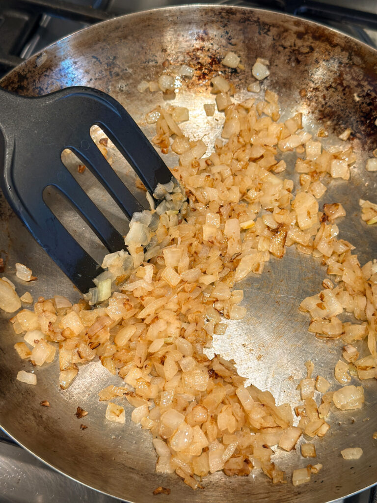 While the butter is melting, peel and dice an onion finely. Add the onion to the saucepan with a pinch of salt, stirring and sautéing about 10-15 minutes. Once the onion is golden and soft, remove from the heat and allow to cool while you mix your dough.