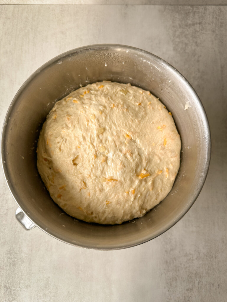 Cover the bowl and allow the dough to rest 30 minutes, then add the shredded cheese. Knead the dough with a mixer on low for 1-2 minutes to incorporate the cheese, or perform a set of stretch and folds if kneading the dough by hand.