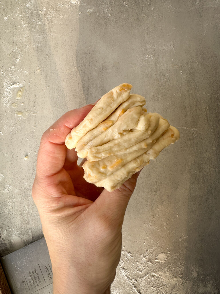 - Cover the bowl and allow the dough to rest 30 minutes, then add the shredded cheese. Knead the dough with a mixer on low for 1-2 minutes to incorporate the cheese, or perform a set of stretch and folds if kneading the dough by hand.(100g) 1 cup shredded sharp cheddar cheese