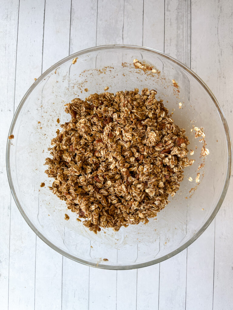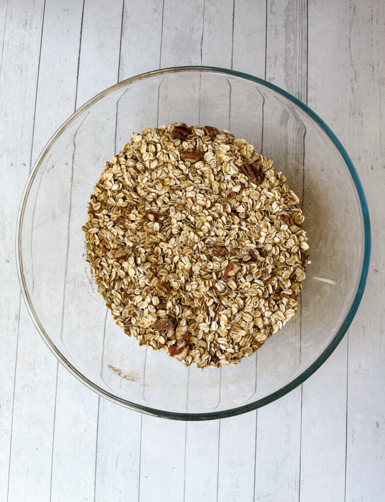 Weigh out and chop your pecans into rough sized chunks. Toss in a large mixing bowl. Add your oats, flaxseed, cinnamon, cardamom, brown sugar, and salt to the mixing bowl. Mix until everything is well mixed. Set aside.
