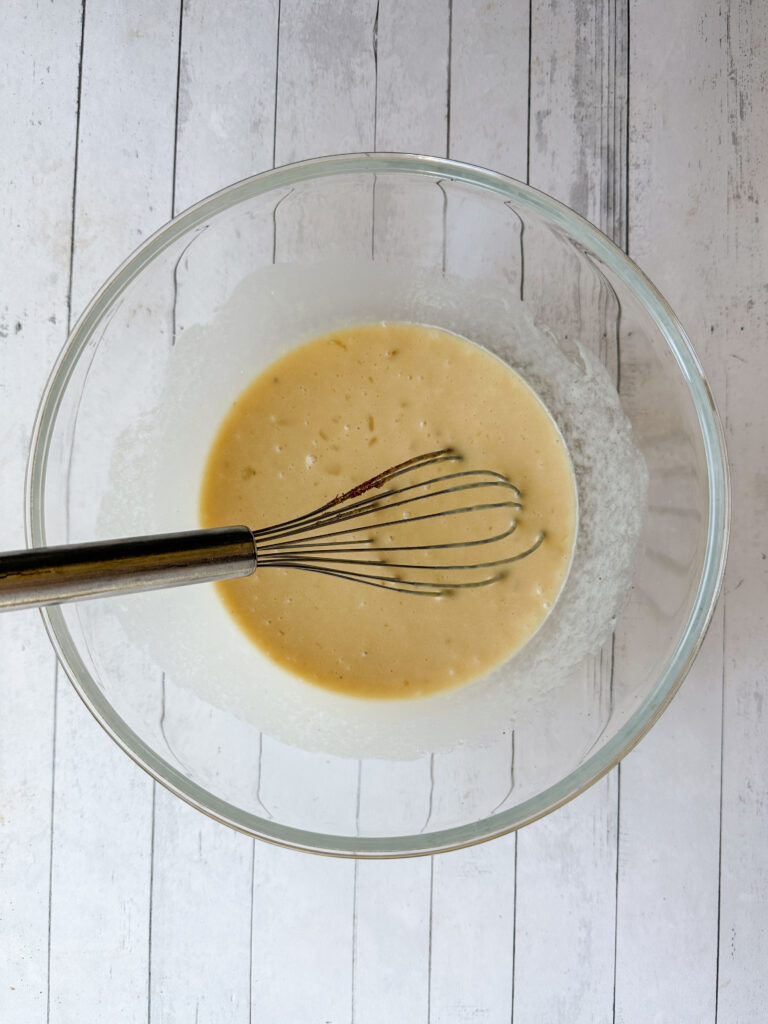 Allow the butter to cool slightly, then add your sourdough discard, maple syrup, honey, maple flavoring, vanilla extract, and Greek yogurt. Whisk together the wet ingredients until smooth.