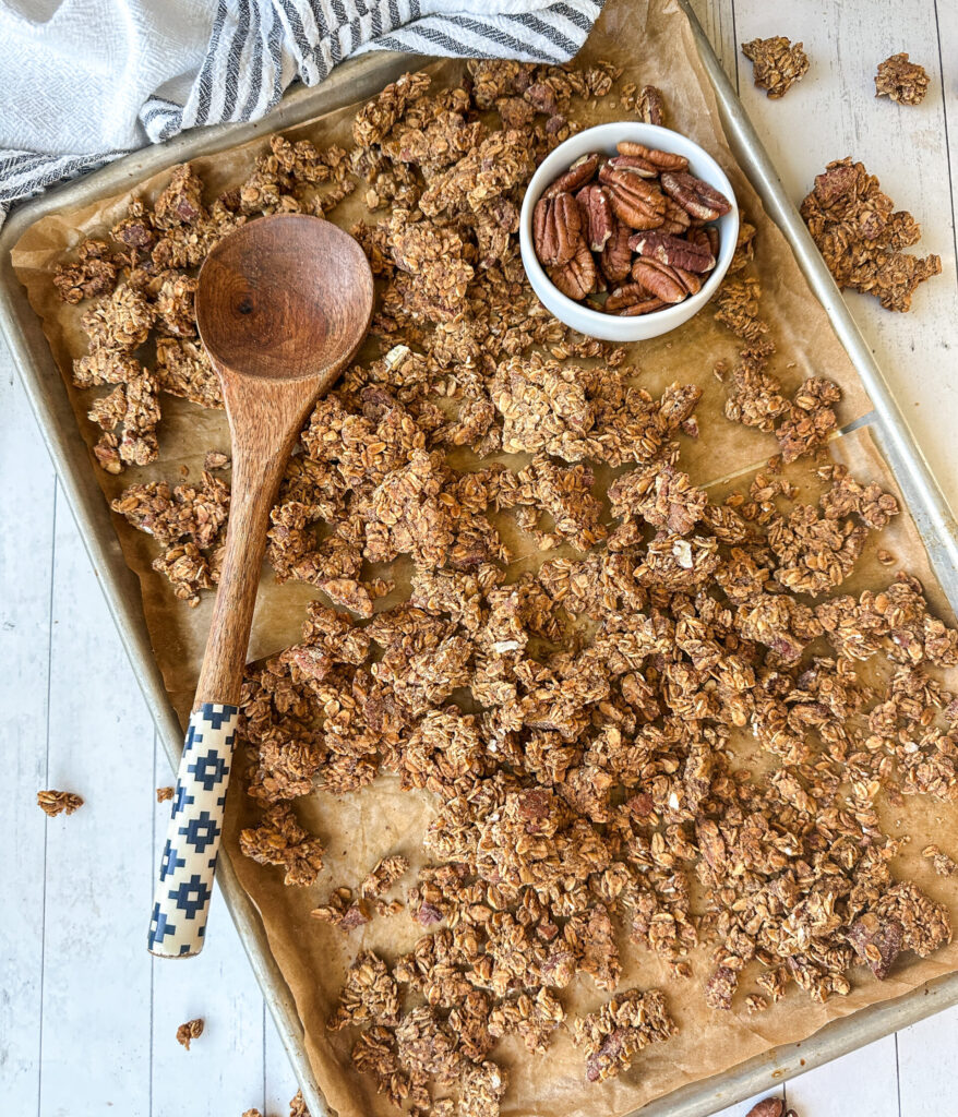 - Spread the granola mixture onto the prepared baking sheet in an even layer, pressing the granola firmly down on the sheet for chunkier clusters.