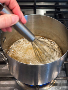 - In a medium sized pot, melt your butter (3/4 cup or 170g total) over medium heat. Allow to gently cook, whisking occasionally until the butter is a deep golden brown with small amber flecks.1/2 cup (113g) unsalted butter, browned, 1/4 cup (50g) unsalted butter, browned