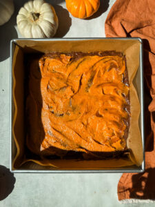 Add in a layer of pumpkin blondie with a touch of pumpkin spice that perfectly balances the chocolate, swirled to create the cutest little pumpkins which will be such a hit at all your fall parties. Simple to make with bakery worthy results! Top with flaky sea salt for maximum flavor.