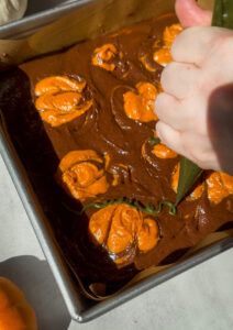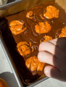 - Drop small spoonfuls of the remaining pumpkin blondie on top of the brownie, spreading to form little ovals.