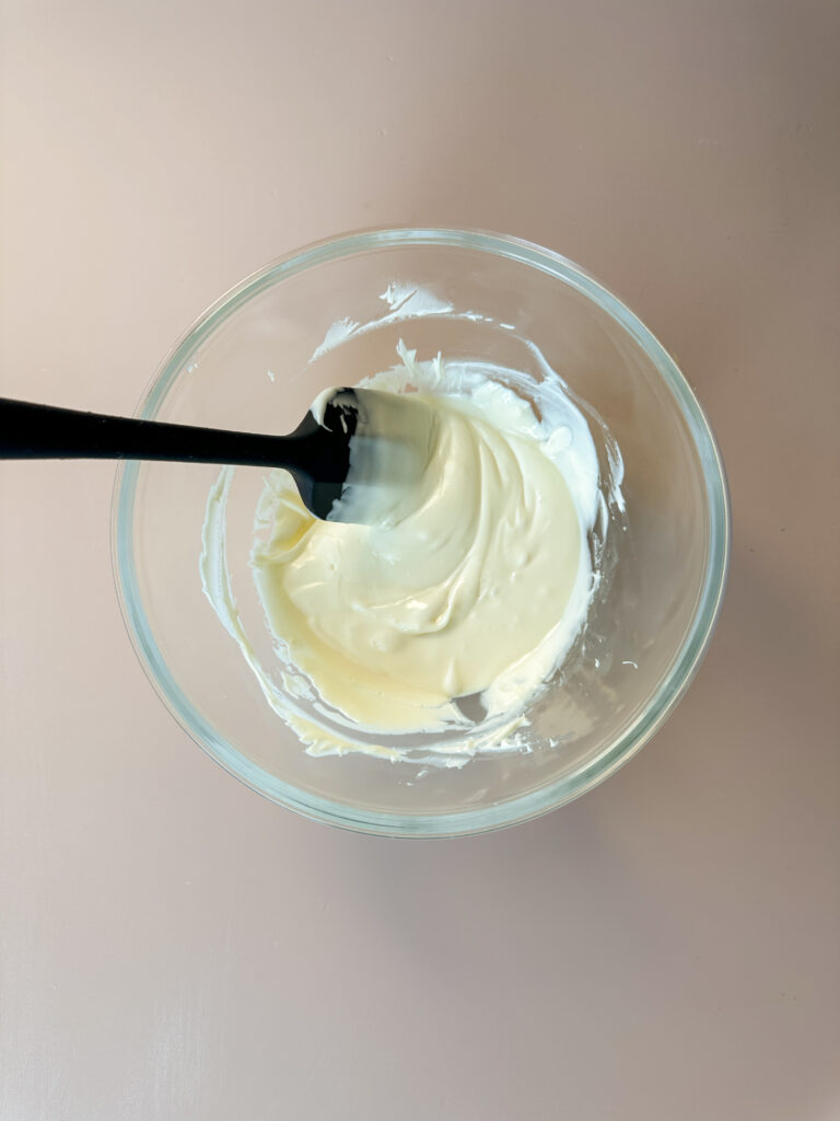In a microwave safe bowl, melt the white chocolate chips until smooth. I only do short 20 second bursts, because white chocolate can easy burn and clump. Add the coconut oil to help thin the white chocolate, and whisk until smooth.