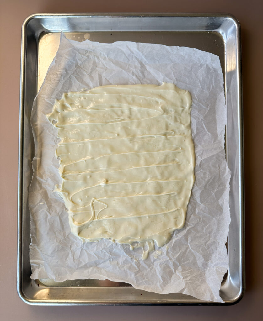 - Pour the melted white chocolate onto a lined baking sheet (parchment or a silicone mat). Spread the white chocolate until it’s quite thin, about 1/8 inch thickness. Transfer the pan to the refrigerator to harden the chocolate while you make the cookie dough (don’t freeze it will make condensation on the chocolate).