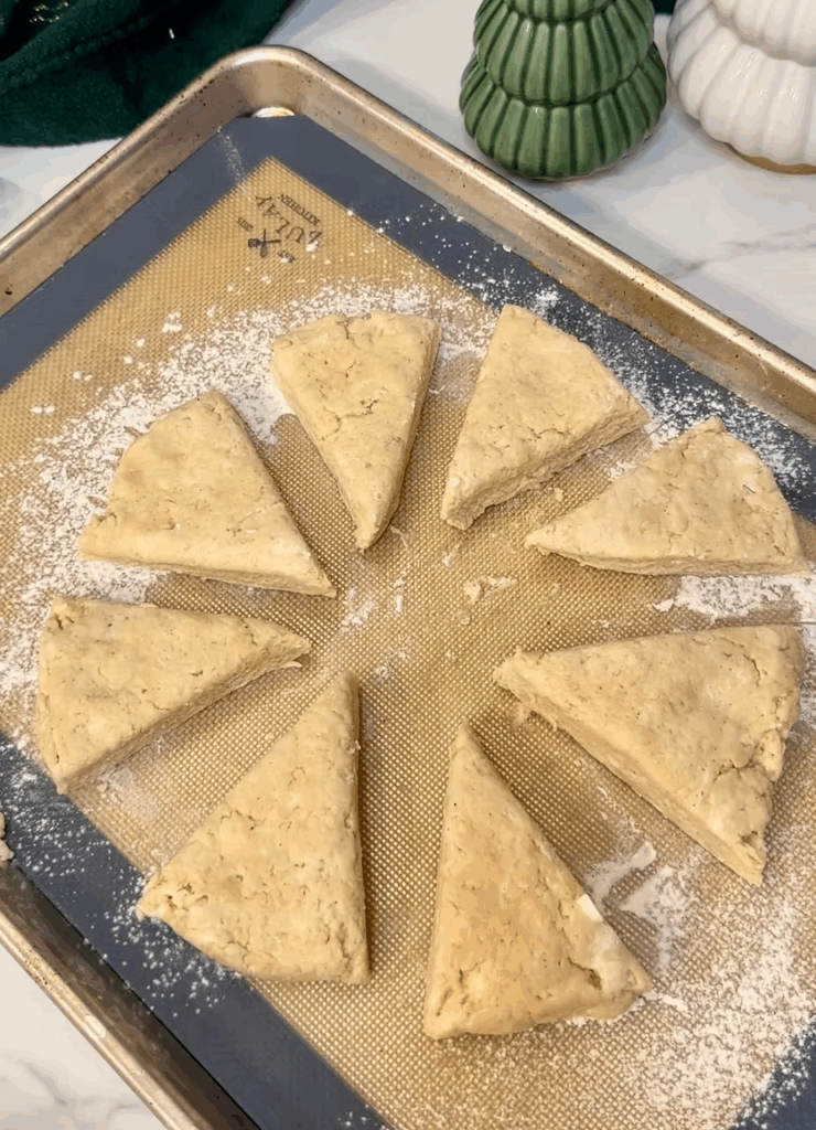 Turn the dough out onto a lightly floured surface. Pat into a 1-inch-thick circle and cut into 8 wedges. For smaller scones, divide the dough into two circles (1 inch thick) and cut each into 8 wedges. A bench knife is useful for this here is the one I use https://amzn.to/3ZwThm0.